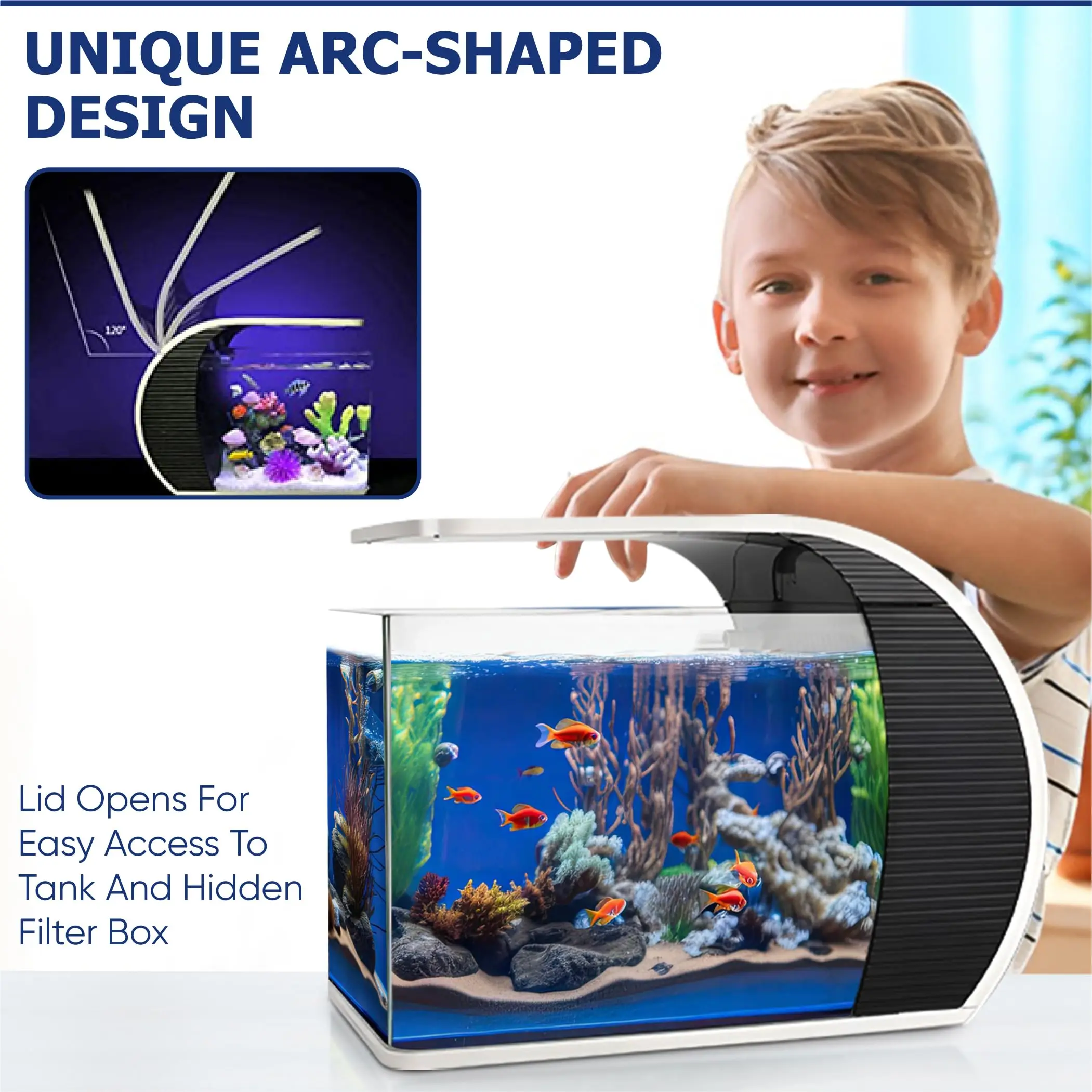 2."LED Lights with Filter" - The product boasts built-in LED lit functions and a water filter, providing an eco-friendly, sustainable aquarium environment.
