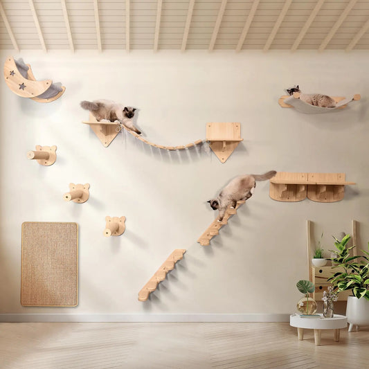 Cat Tree Wall Mounted Climbing Shelves Wooden Hammock with Ladder and Cat Bridge for Cat Perch Sleeping Pet Indoor Playground