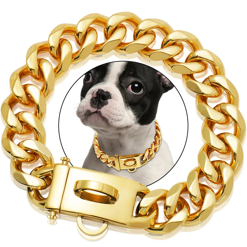 Steel dog chain: made of 316L stainless steel, with maximum strength and durability, 18K gold-plated, super strong dog collar, even if it bears 150 pounds (about 68 kg) of force, it will not be affected.