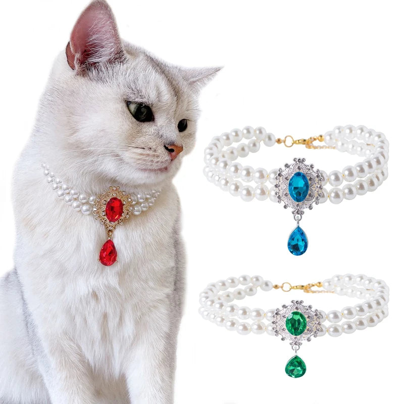 2 Rows Pet Pearls Collar Adjustable Puppy Dog Rhinestone Jewelry Necklaces with Luxury Crystal Accessories for Small Dogs Cats