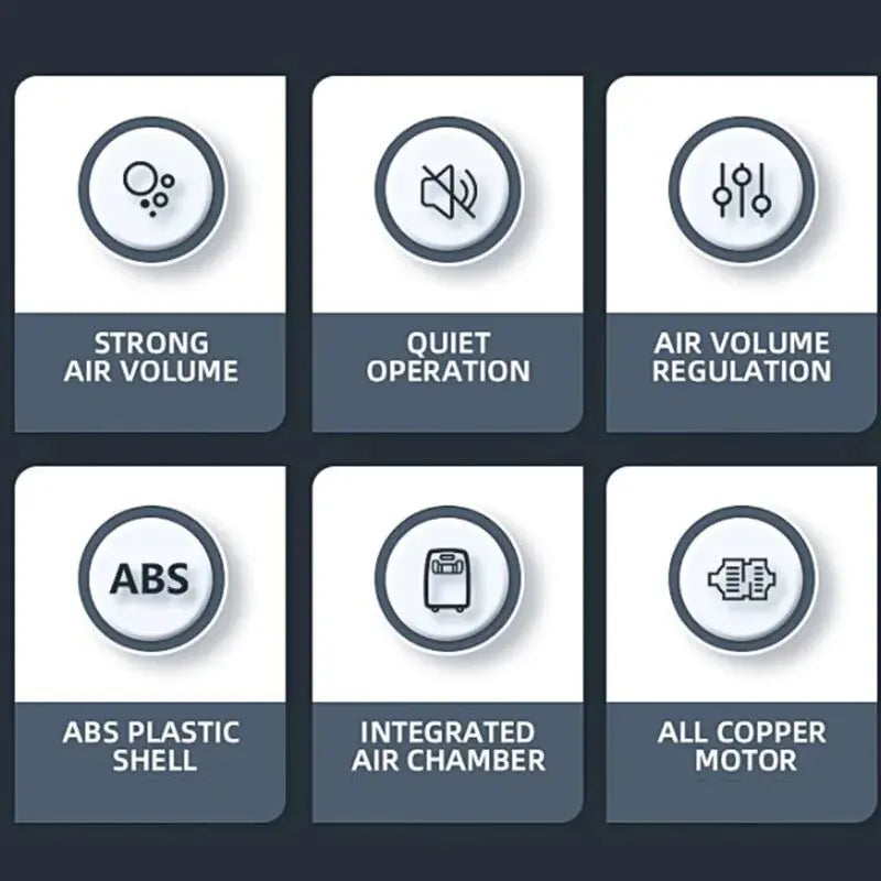 With advanced air compression system and shock absorption system, with multi-stage silencer design, the air pump has no noise.