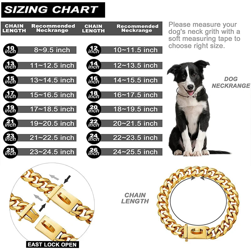 Steel dog chain: made of 316L stainless steel, with maximum strength and durability, 18K gold-plated, super strong dog collar, even if it bears 150 pounds (about 68 kg) of force, it will not be affected.
