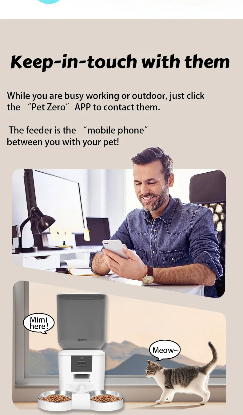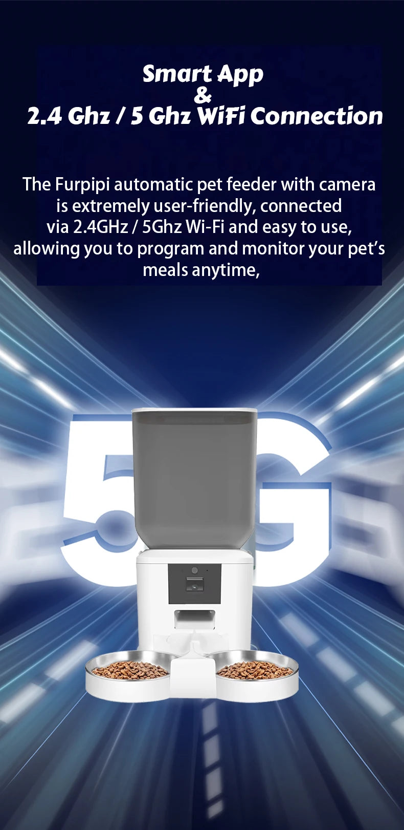 The Furpipi automatic pet feeder with camera is extremely user-friendly, connected via 2.4GHz / 5Ghz Wi-Fi and easy to use, allowing you to program and monitor your pet's meals anytime, anywhere with the "Pet Zero " app for iOS and Android phones. You can feed your pets anytime, anywhere on your smartphone and view the feeding log on App to make sure the cat food dispenser is working as scheduled. The smart cat food dispenser can be controlled from multiple family members' smartphones.