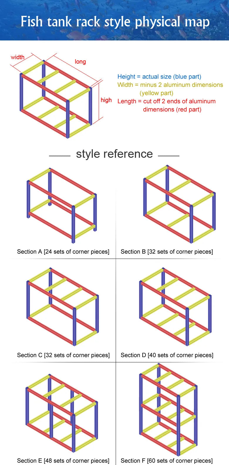 Industrial aluminum profile using both hot and cold processing, have very strong corrosion resistance, no rust, high intensity, strong load-bearing, removable, high plasticity, absolute environmental protection, woodiness perishable, iron rust easily, low grade of stainless steel rust and sealed, so industrial aluminum profile is the best choice for the fish tank/ aquarium stand.