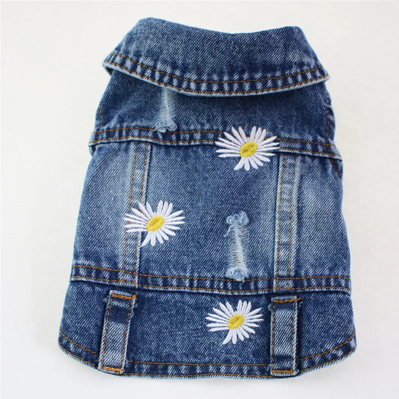 Daisy Embroidery Luxury Dog Clothes for Small Medium Dogs Vintage Washed Dog Jeans Jacket Pet Sleeveless Vest Denim Coat Outfits