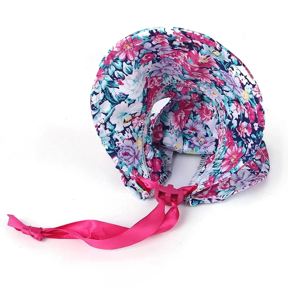 Pet floral hat with cutouts for ears, large brim, lace-up style, adjustable size.