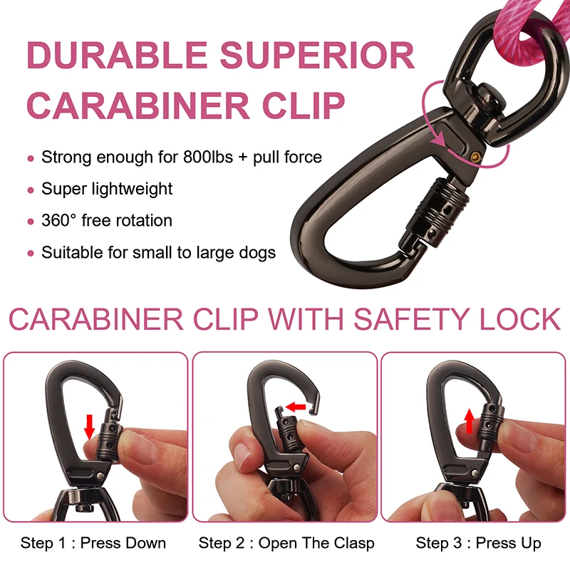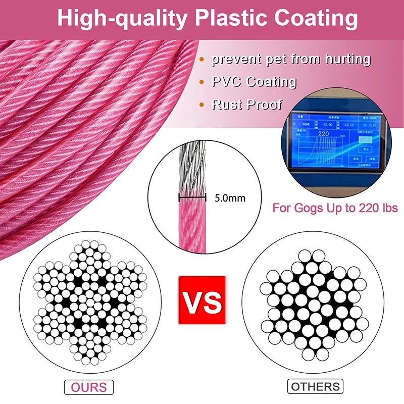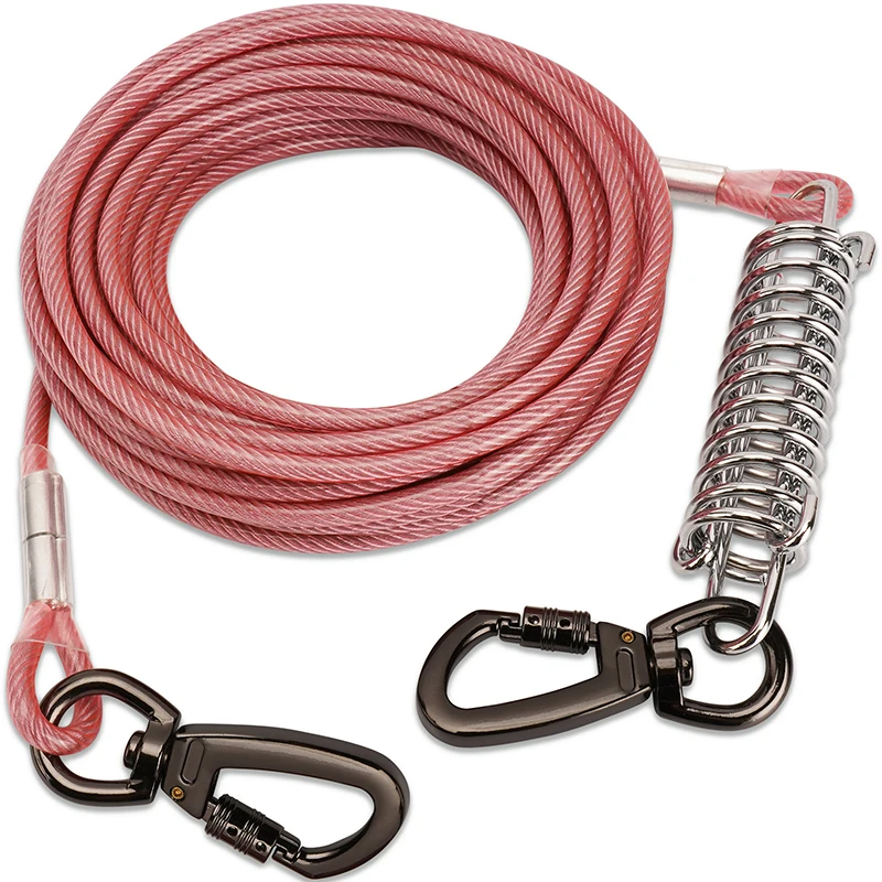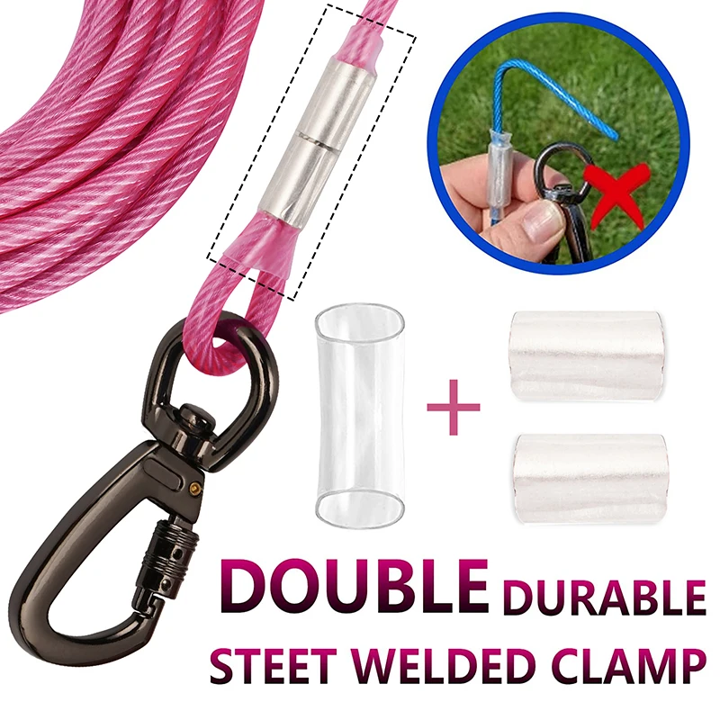 Strong Tie Out Cable: The tie out cable for dog is made of 5mm strong steel wire rope and PVC coating , which is chew and rust proof,the alloy clips with safety lock has rigorously quality tested.At 10/20/30/50 feet long, rigorously tested for dogs up to 250 lbs,has high tensile strength and impact toughnes.