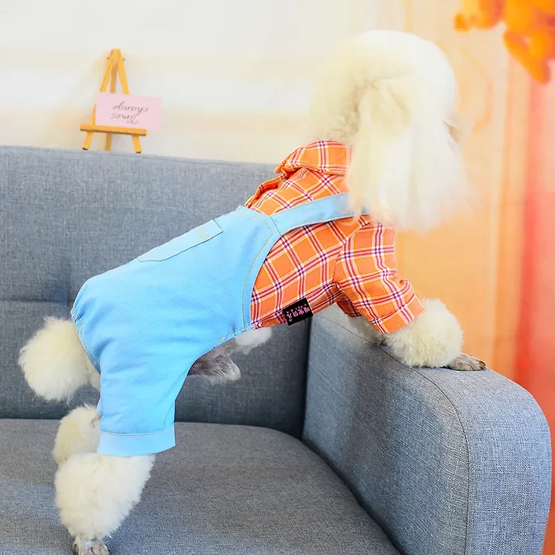 Dogs Clothes Jumpsuits Spring Autumn Denim Sling Plaid Pet T-Shirt Plaid Cat Dress Pet Puppy Skirt Teddy Puppy Clothes Small Dog