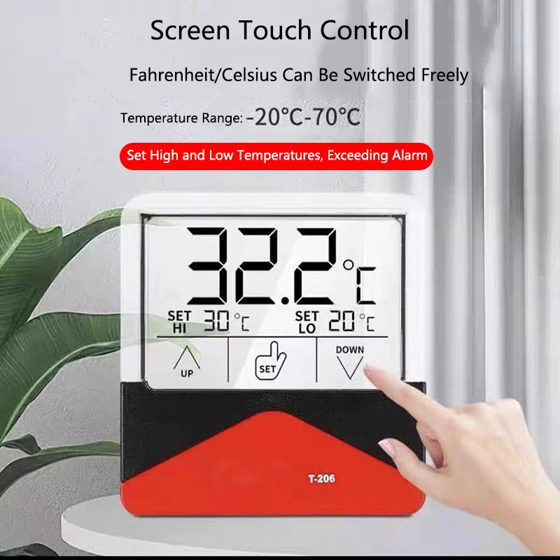 T-206 Touch screen model :High and low temperatures can be set, and if the temperature exceeds the range, an alarm will be triggered (screen temperature flashing indicates an alarm)