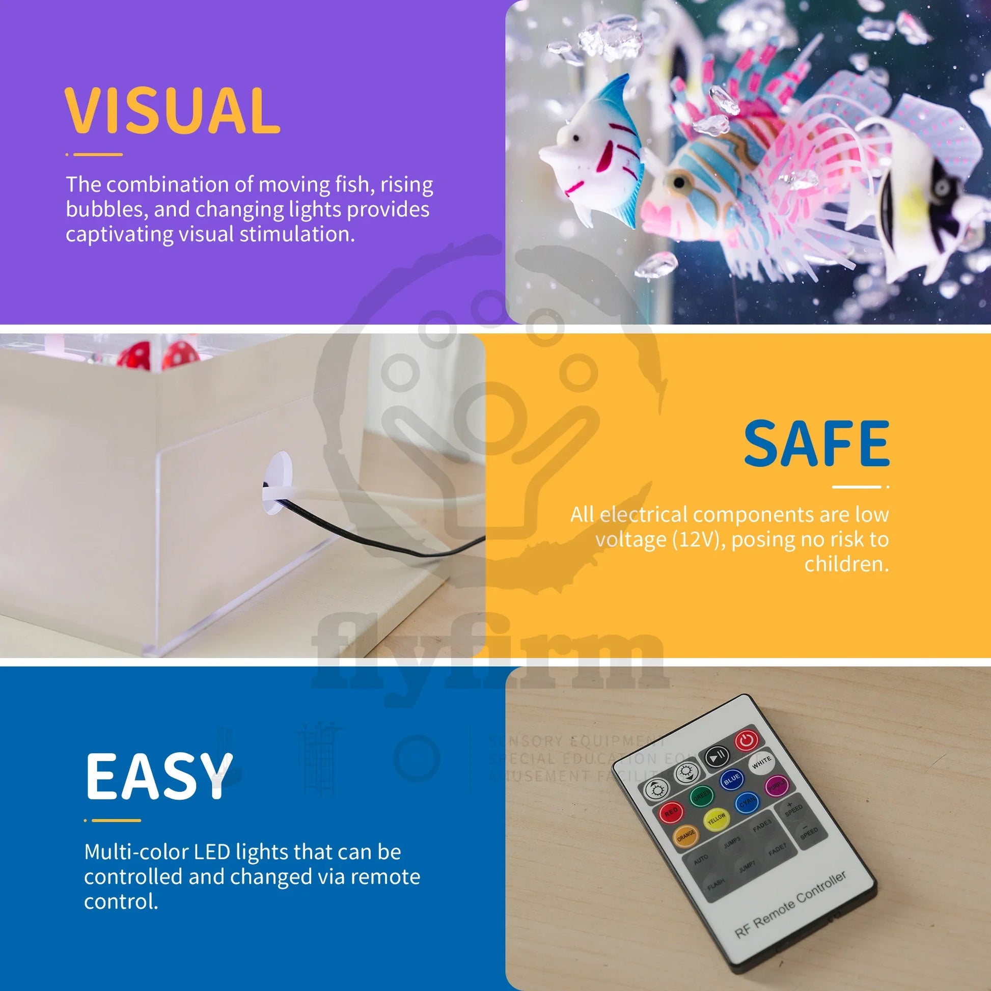 The LED lighting system at the bottom of the tank illuminates the fish and bubbles, creating a mesmerizing underwater scene. All lighting and bubble effects are controllable via a remote, allowing users to customize their experience. The combination of moving fish, dynamic bubbles, and colorful lighting provides a captivating and relaxing environment, perfect for sensory stimulation and stress relief.
