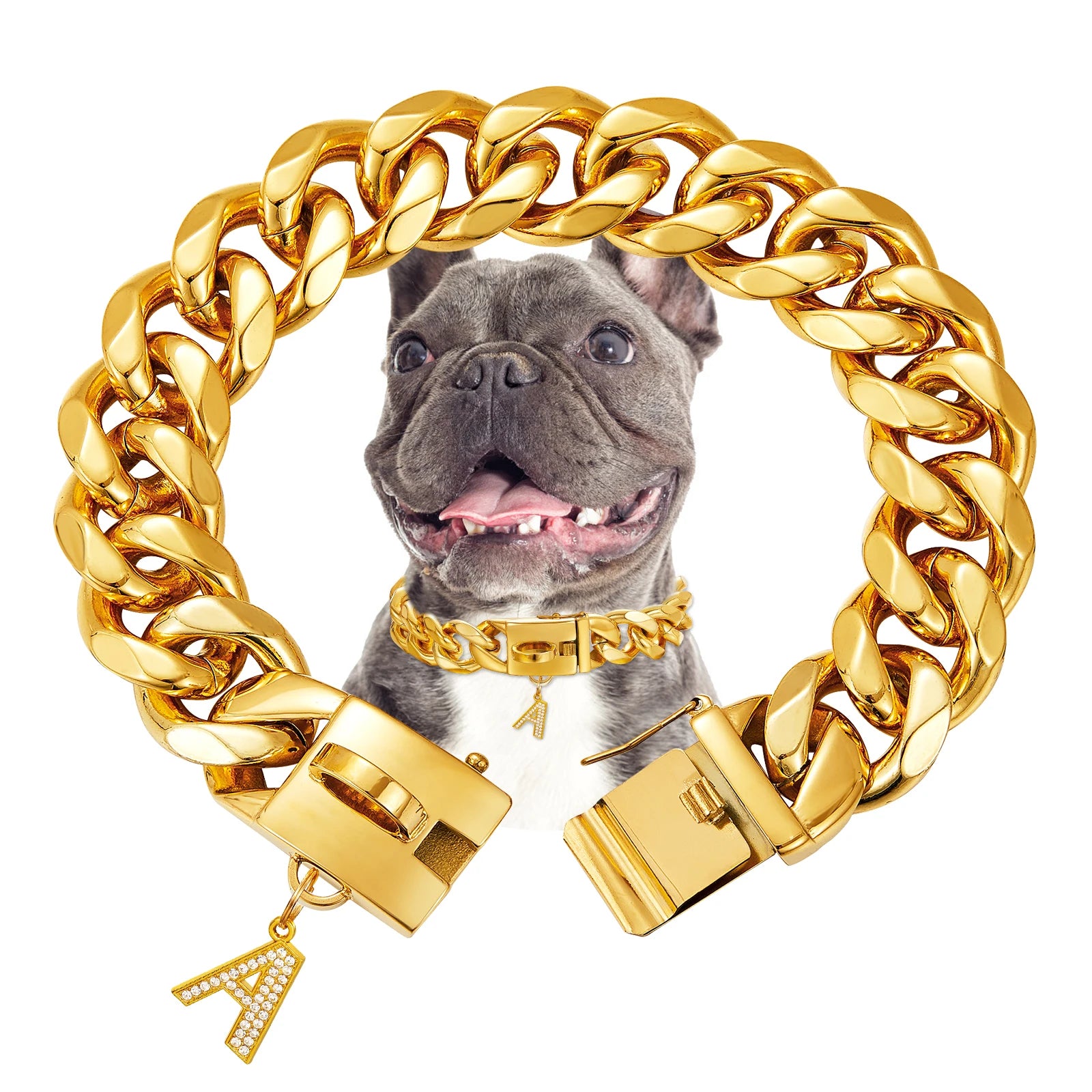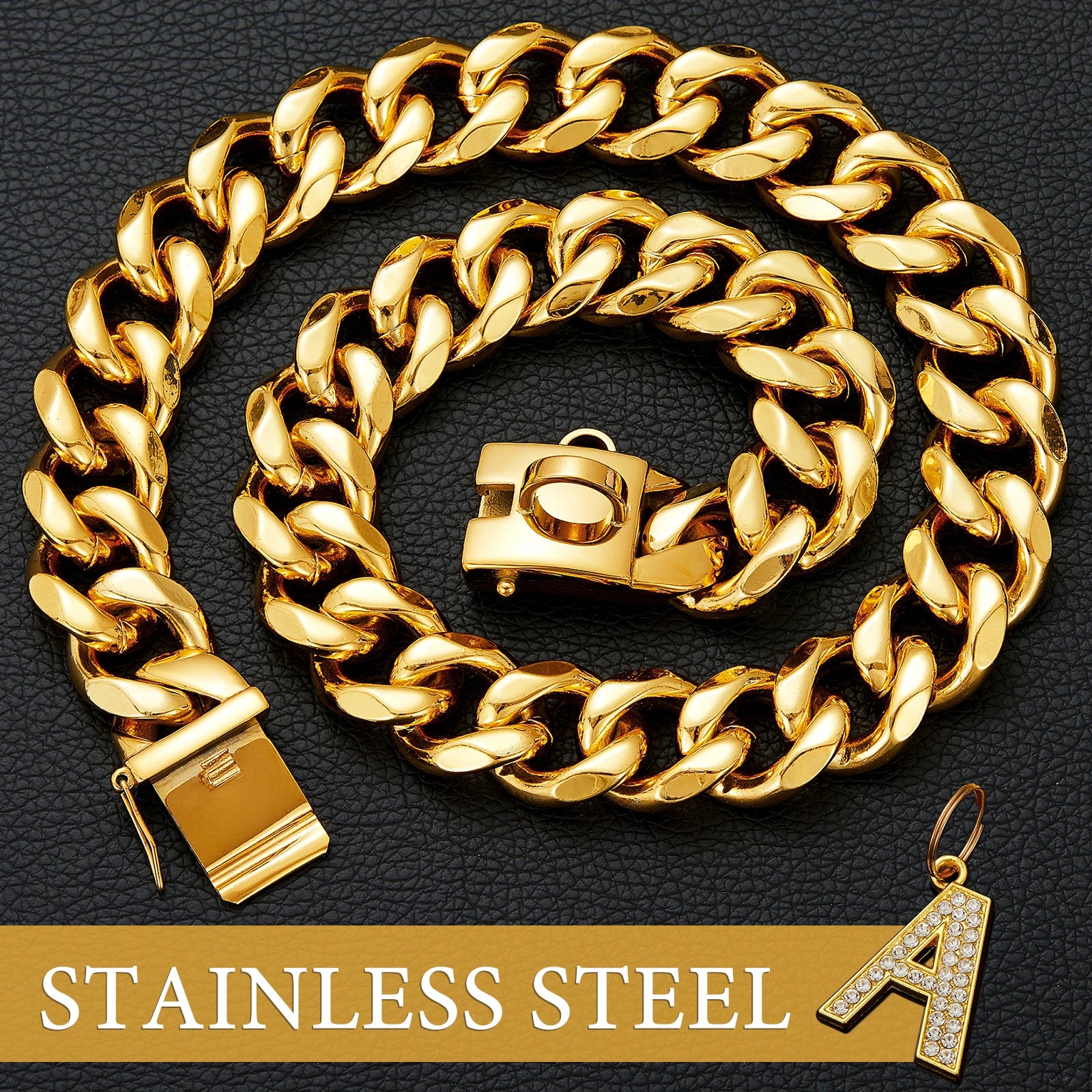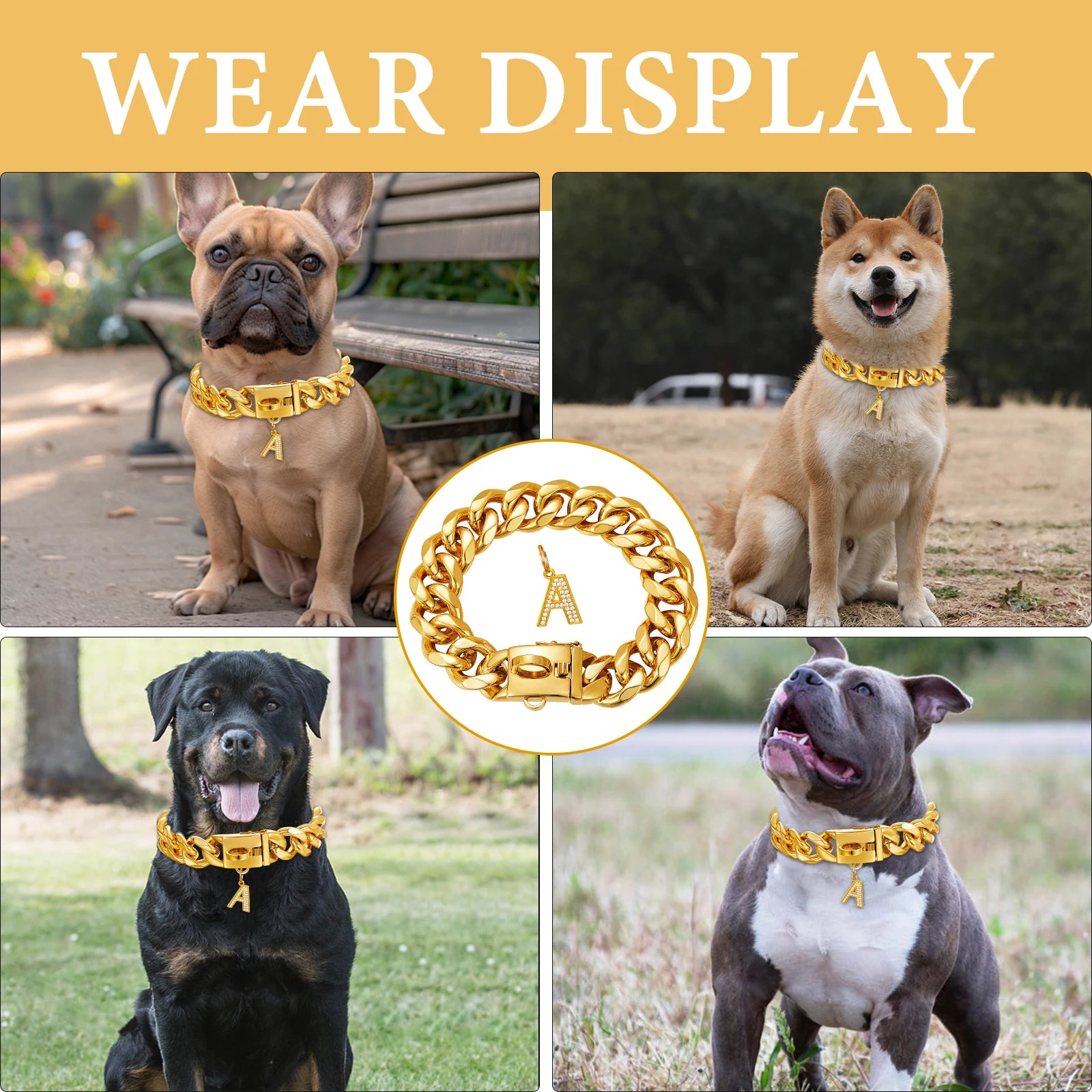 Gold Dog Chain Collar with Pendant A 15/19mm Wide Cuban Link Strong Stainless Steel Chew Proof Collar for Small Medium Large Dog