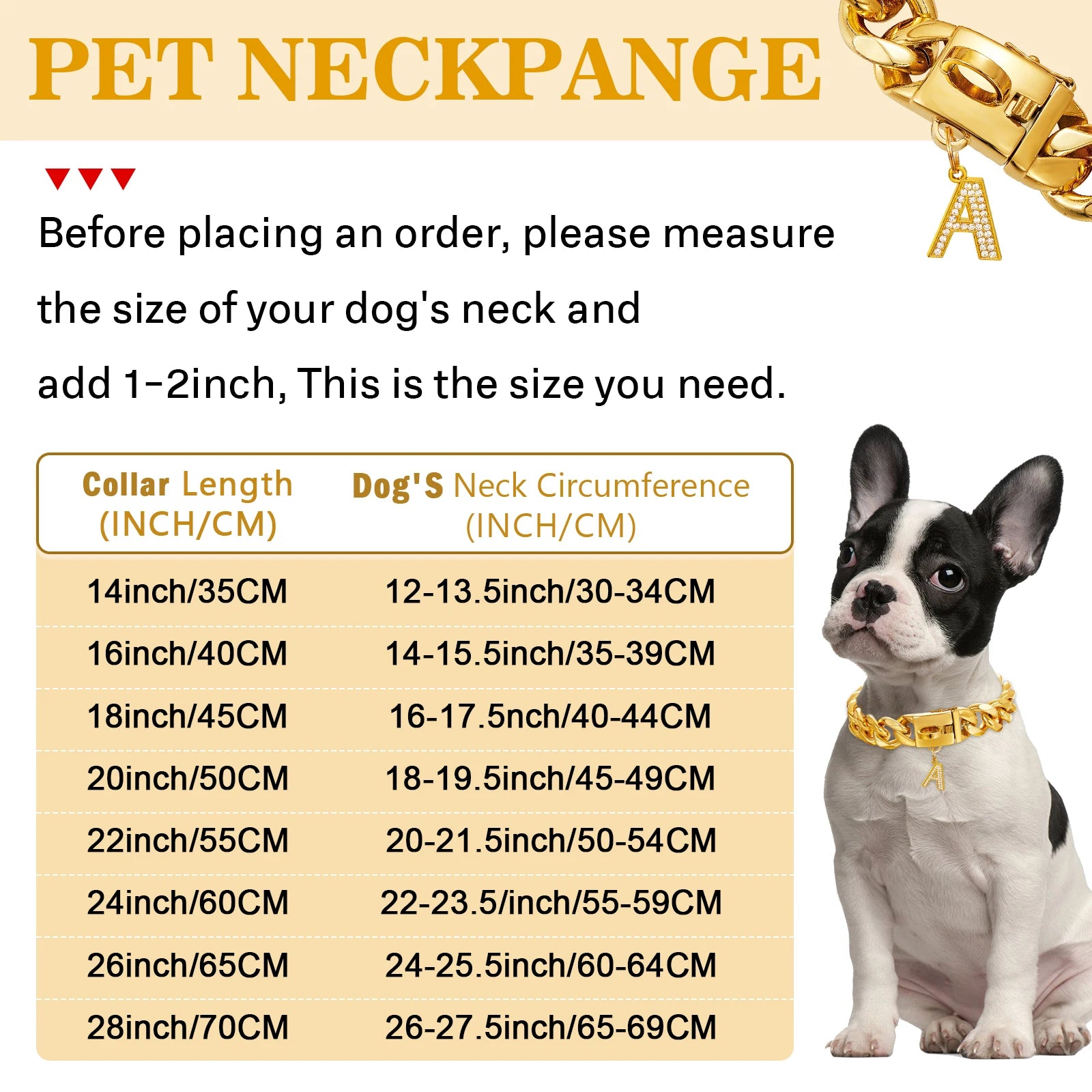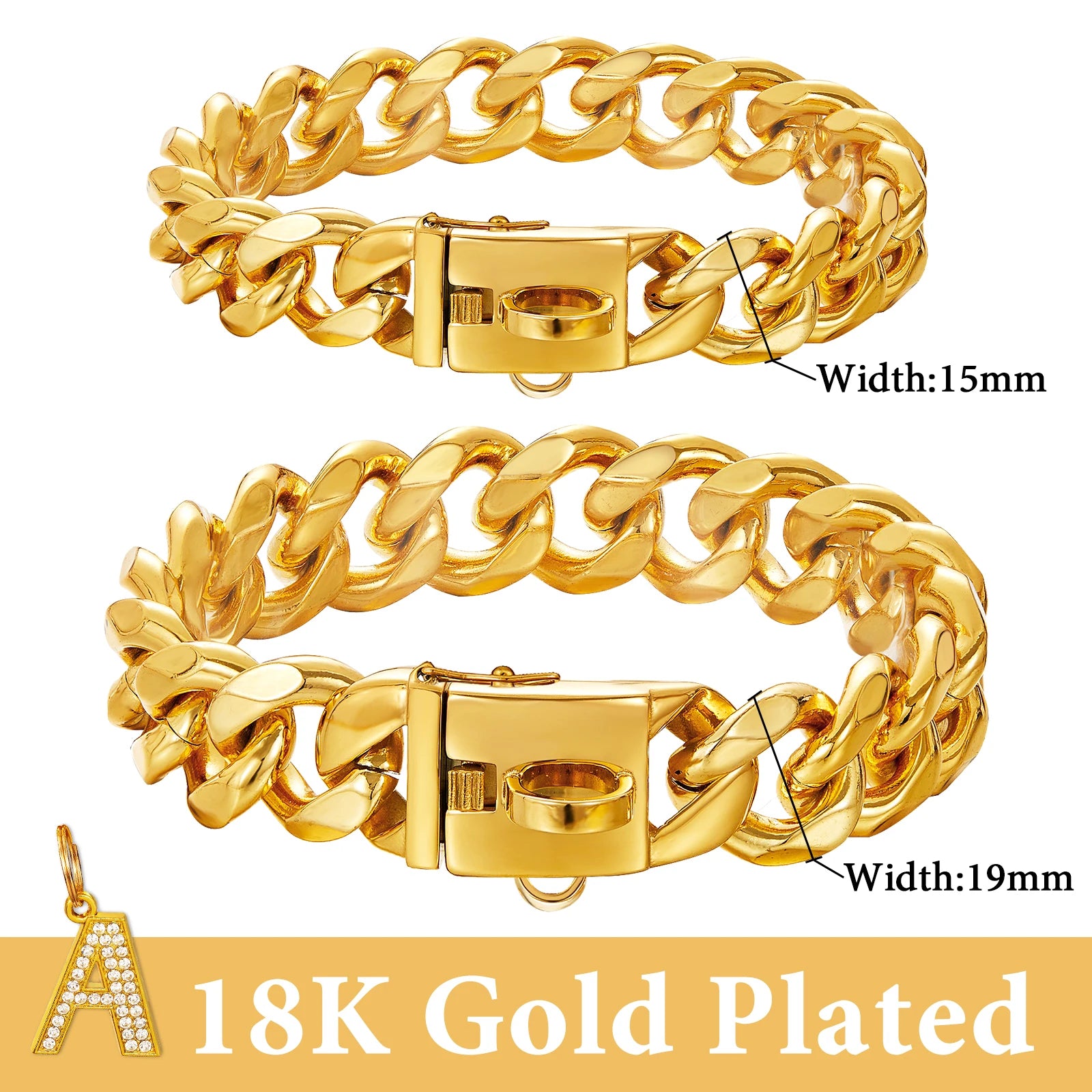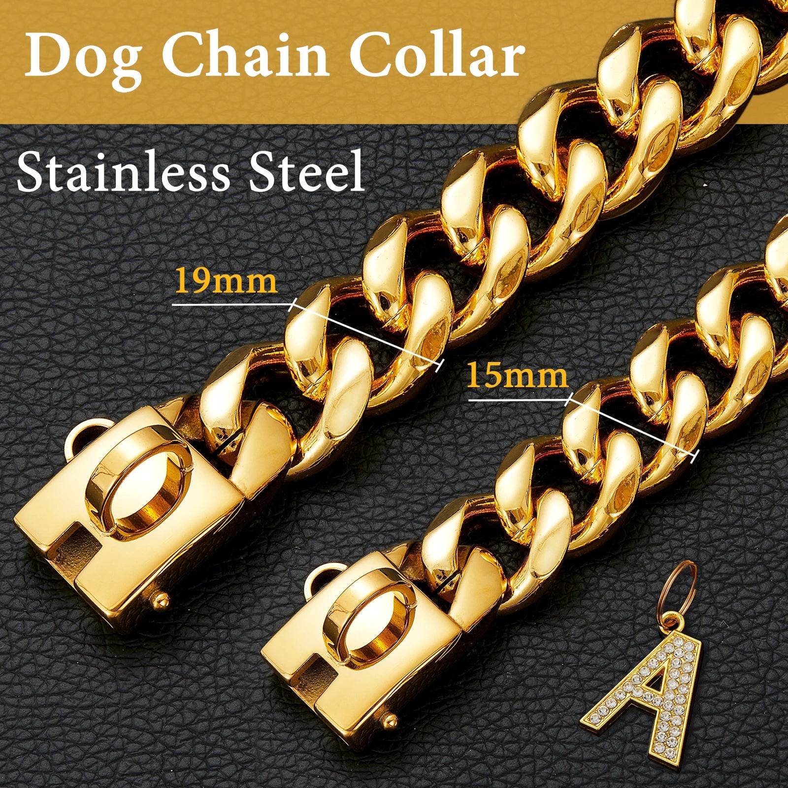 Gold Dog Chain Collar with Pendant A 15/19mm Wide Solid Cuban Link Chain Strong Stainless Steel Chew Proof Collars for Small Medium Large Dogs
