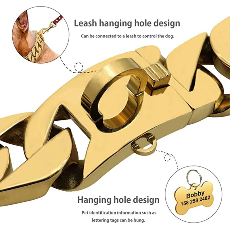 Golden Stainless Steel Dog Collar, Heavy Duty Pet Chain, Necklace with Shrapnel Clasp for Medium and Big Dogs Usage, 32mm Width