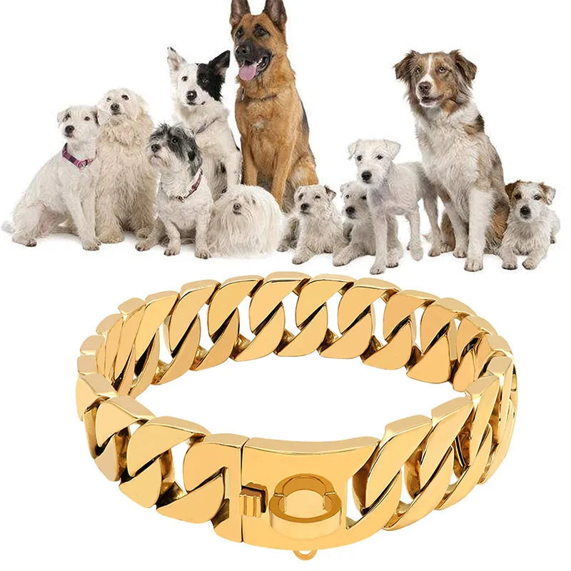 Steel dog chain: made of 316L stainless steel, with maximum strength and durability, 18K gold-plated, super strong dog collar, even if it bears 150 pounds (about 68 kg) of force, it will not be affected.