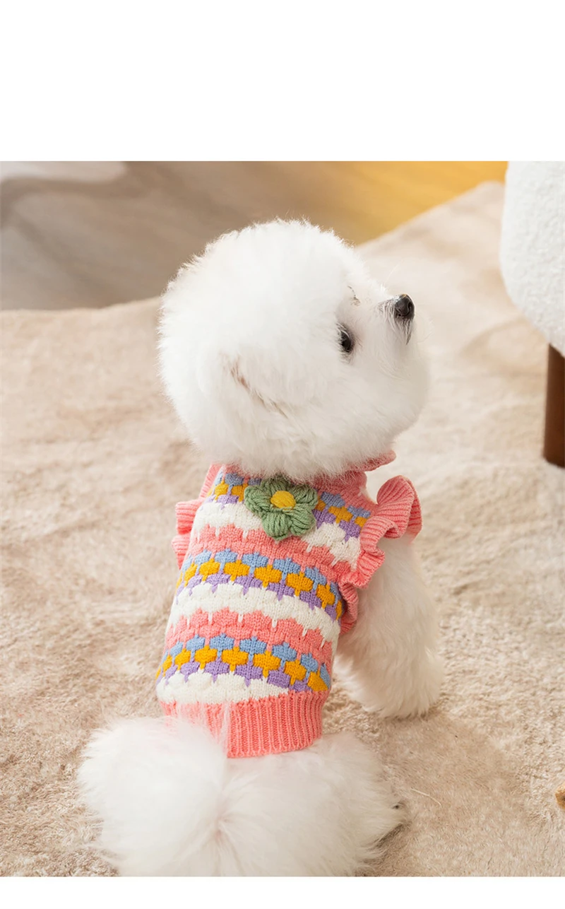 Knitted Flower Pet Dog Sweaters Orange Winter Warm New Year Clothing for French Bulldog Outfits Fancy Small Puppy Overalls