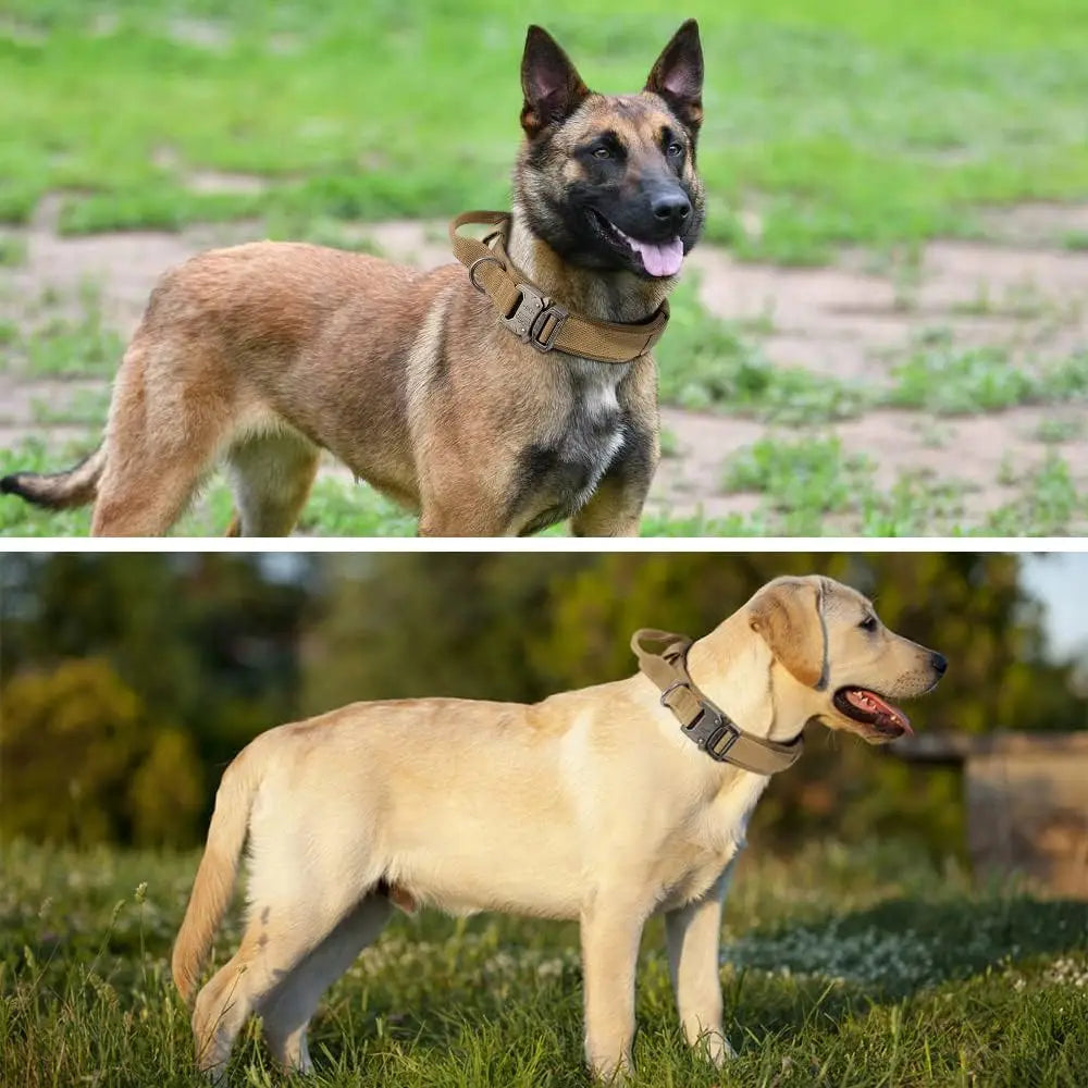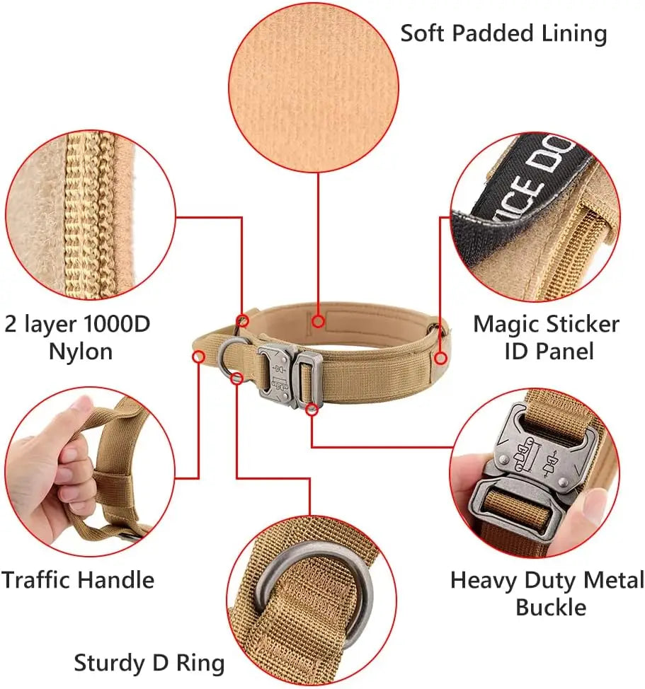 Durable & Strong — This Tactical Dog collar is made of 100% high-quality 1000D nylon and filled with soft padding, which makes it comfortable and hypo-allergenic to dogs. Designed with double closure--Heavy Metal Buckle and D Ring, it's stable and firm, suitable for Medium and Large Dogs.