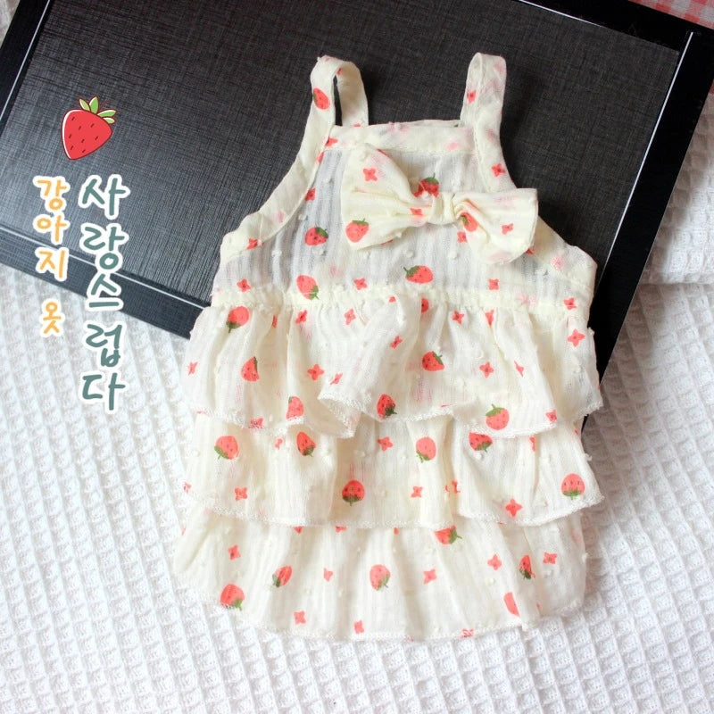 Light Pink Summer Fancy Dresses Strawberry Print Princess Bow Tie Tiered Skirt Vest Overalls Female New Puppy Clothing for Cats