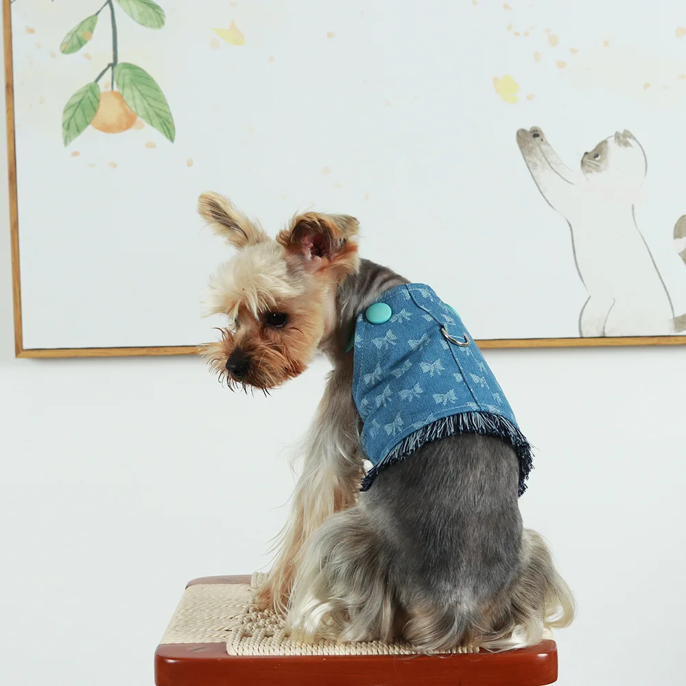 Full Bowknot Printed Dog Harness and Leash Set for Small Dogs Cool Tassels Denim Vest Jacket Pet Jeans Harness Chhuahua Yorkie ShihTzu French Bulldog Terrier