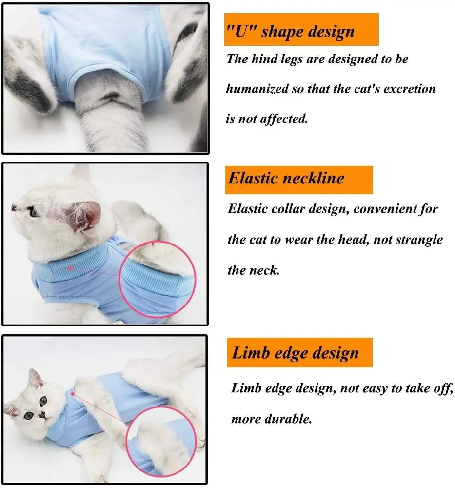 Cats Recovery Suit is mainly used for: Postoperative sputum prevention, and keeping warm after shaving which is also applied for puppy and other pets.