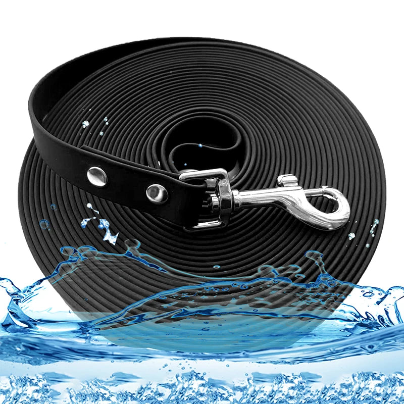 1.The dog leash can drag through the water and sand without getting wet and sand doesn't really stick to it.Easy to clean,it doesn't get all wet and stinky.The material is pretty disinclined to knot,even when swriling around other dogs feet.
