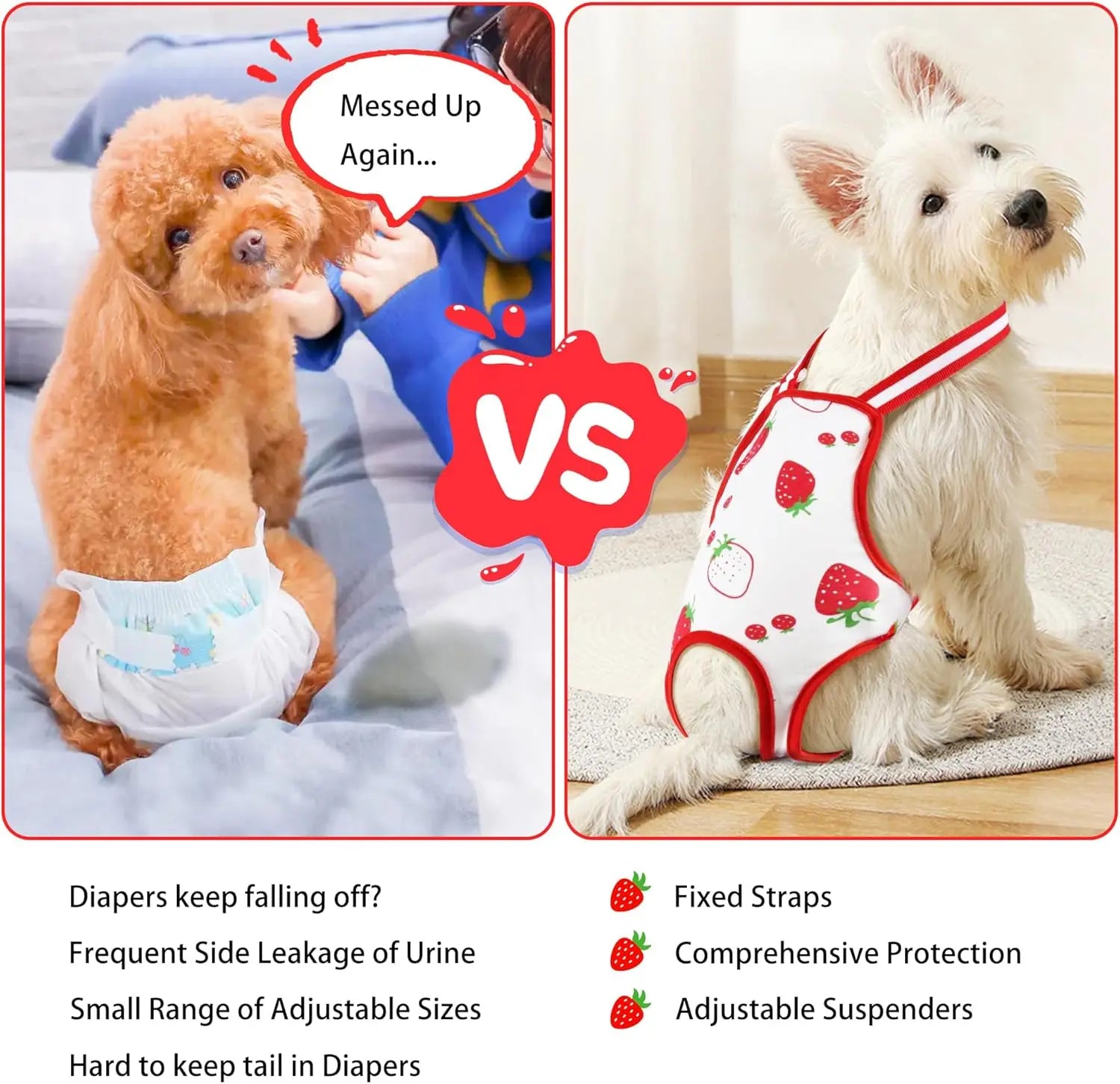 Dog Diapers for Female Dogs, Strawberry Sanitary Panties with Adjustable Suspender, Washable Reusable Puppy Sanitary Panties Cute Pet Underwear Diaper Jumpsuits for Female Male Dogs