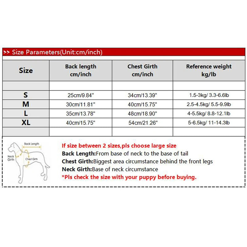XL:Back length 40cm/15.75'' Chest girth 54cm/21.26'' Ref. weight 5-6.5kg/11-14.3lb;