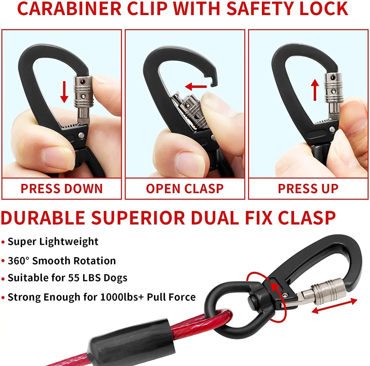 Strong Tie Out Cable: The tie out cable for dog is made of 5mm strong steel wire rope and PVC coating , which is chew and rust proof,the alloy clips with safety lock has rigorously quality tested.At 10/20/30/50 feet long, rigorously tested for dogs up to 250 lbs,has high tensile strength and impact toughnes.