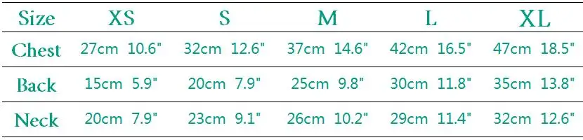 XS: Back Length 15cm/5.91'', Chest: 27cm/10.63'', Neck: 20cm/7.87'';