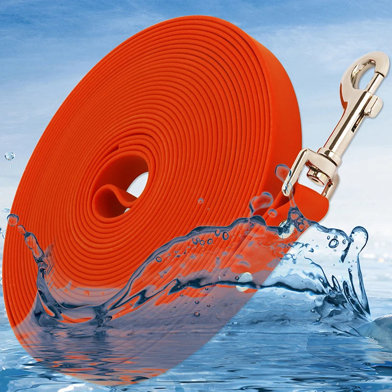 1.The dog leash can drag through the water and sand without getting wet and sand doesn't really stick to it.Easy to clean,it doesn't get all wet and stinky.The material is pretty disinclined to knot,even when swriling around other dogs feet.