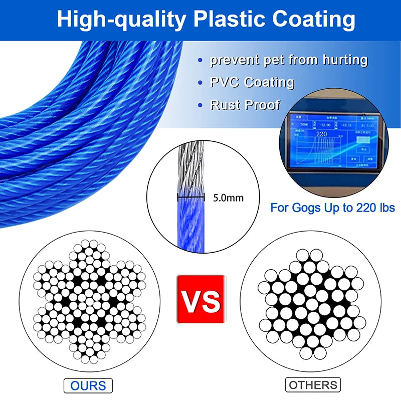 Strong Tie Out Cable: The tie out cable for dog is made of 5mm strong steel wire rope and PVC coating , which is chew and rust proof,the alloy clips with safety lock has rigorously quality tested.At 10/20/30/50 feet long, rigorously tested for dogs up to 250 lbs,has high tensile strength and impact toughnes.