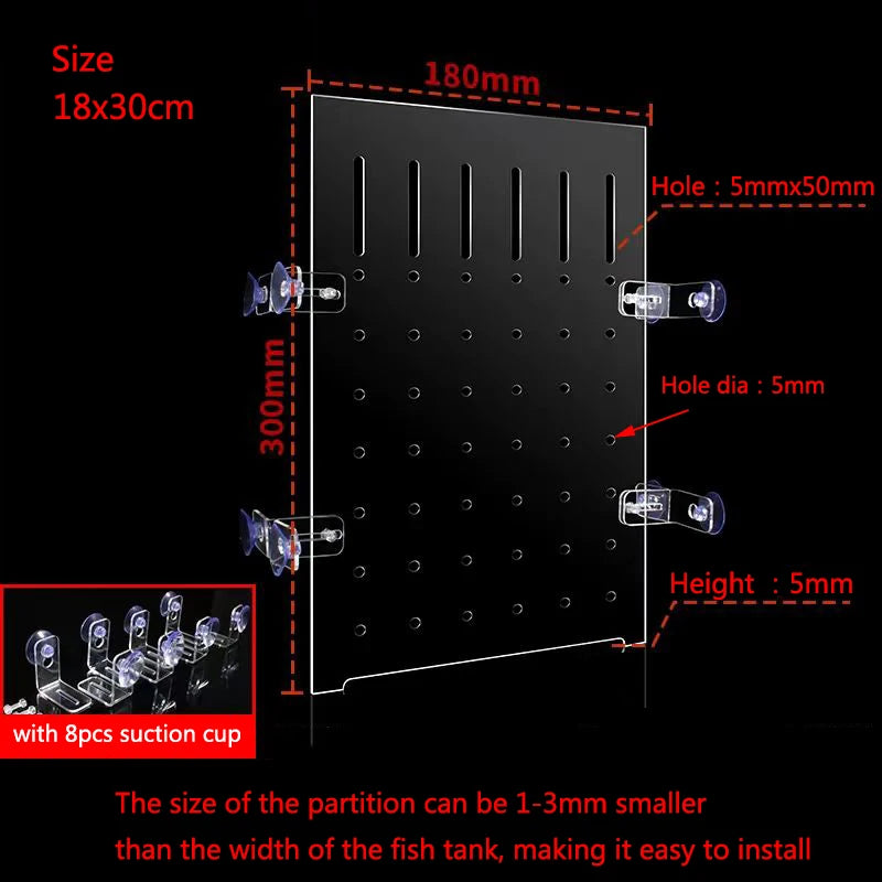 Note:The width of the partition can be 1-3mm smaller than the width of the fish tank. More convenient to install.