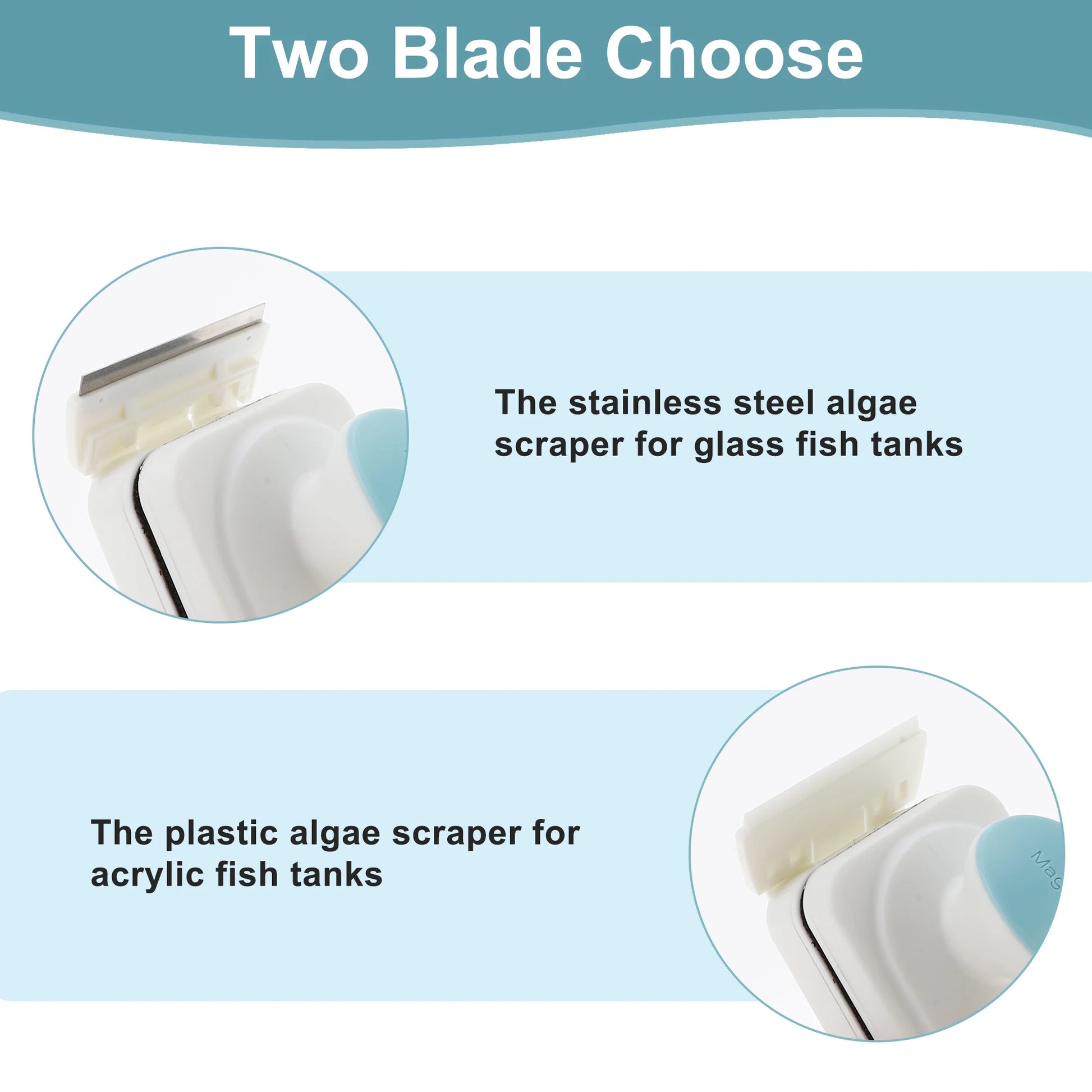 • The aquarium magnetic glass cleaning brush is constructed with a plastic body. It features a detachable scraper that comes in either stainless steel or plastic. The stainless steel blade is designed for use on glass fish tanks, while the plastic scraper is ideal for acrylic fish tanks.