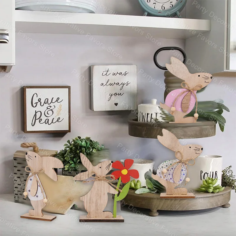 2025 Easter Wooden Rabbit Ornaments Standing Bunny with Flower for Spring Easter Party Home Table Decoration DIY Crafts Supplies