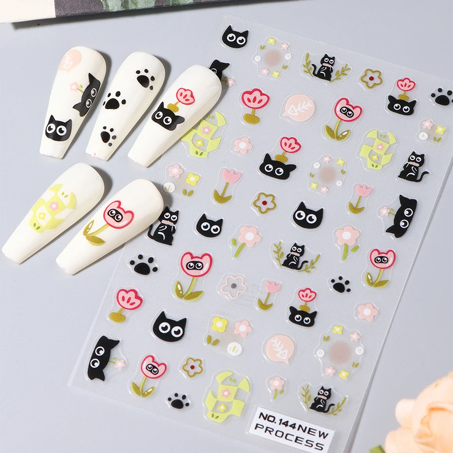 2pcs Black Cat Nail Stickers 3D Cute Cartoon Animal 3D Self-Adhesive Nail Art Decals Sliders Decorations Manicure Accessories