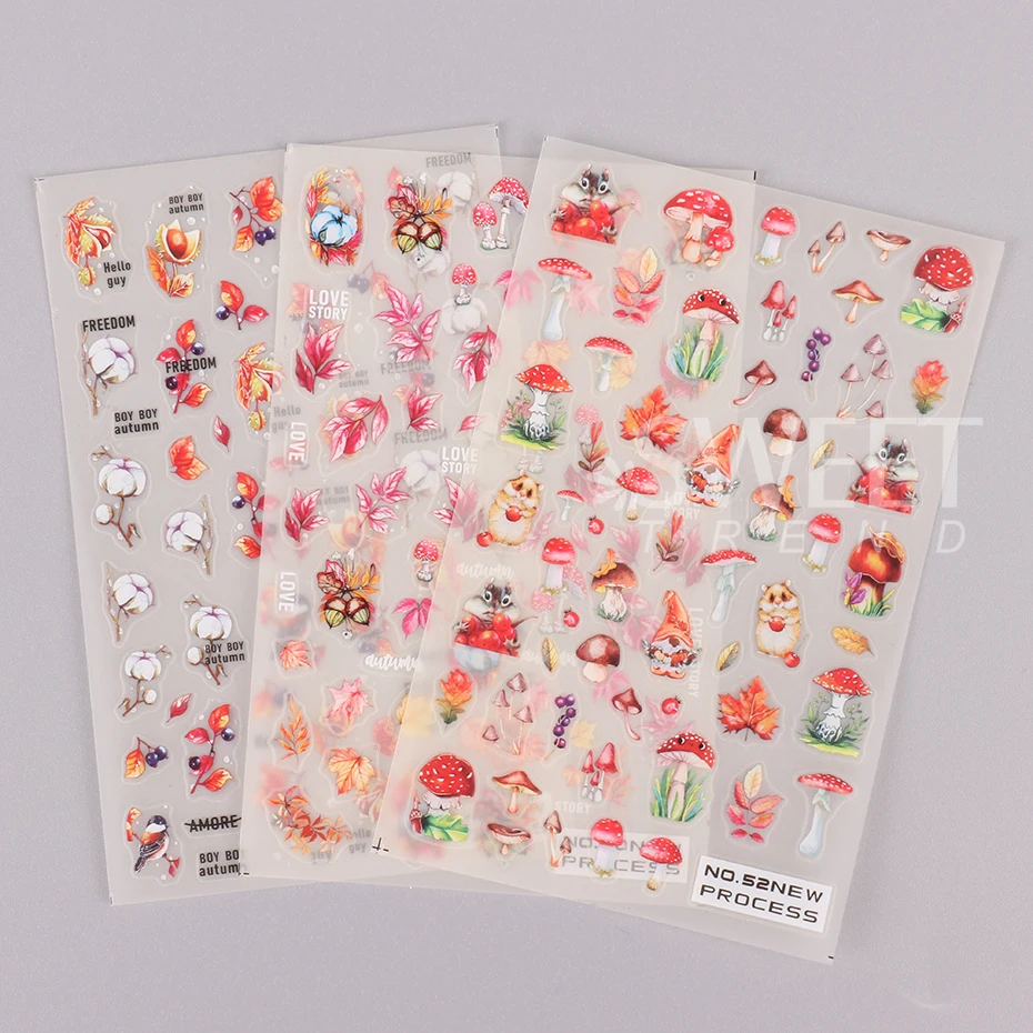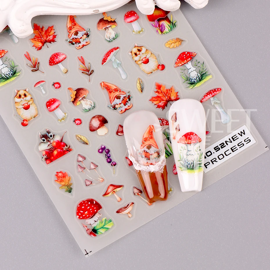 2pcs/set Autumn Maple Leaf Nail Art Sticker Bird Cotton Squirrel Mushroom Pumpkin Design Nail Decal Sliders Manicure Decoration
