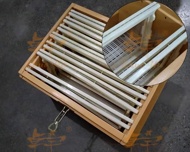 5.Standard features include screened bottom board with pollen trap and drawer, entrance reducer, queen excluder, division/uniting board, frame spacers, and top feeder.
