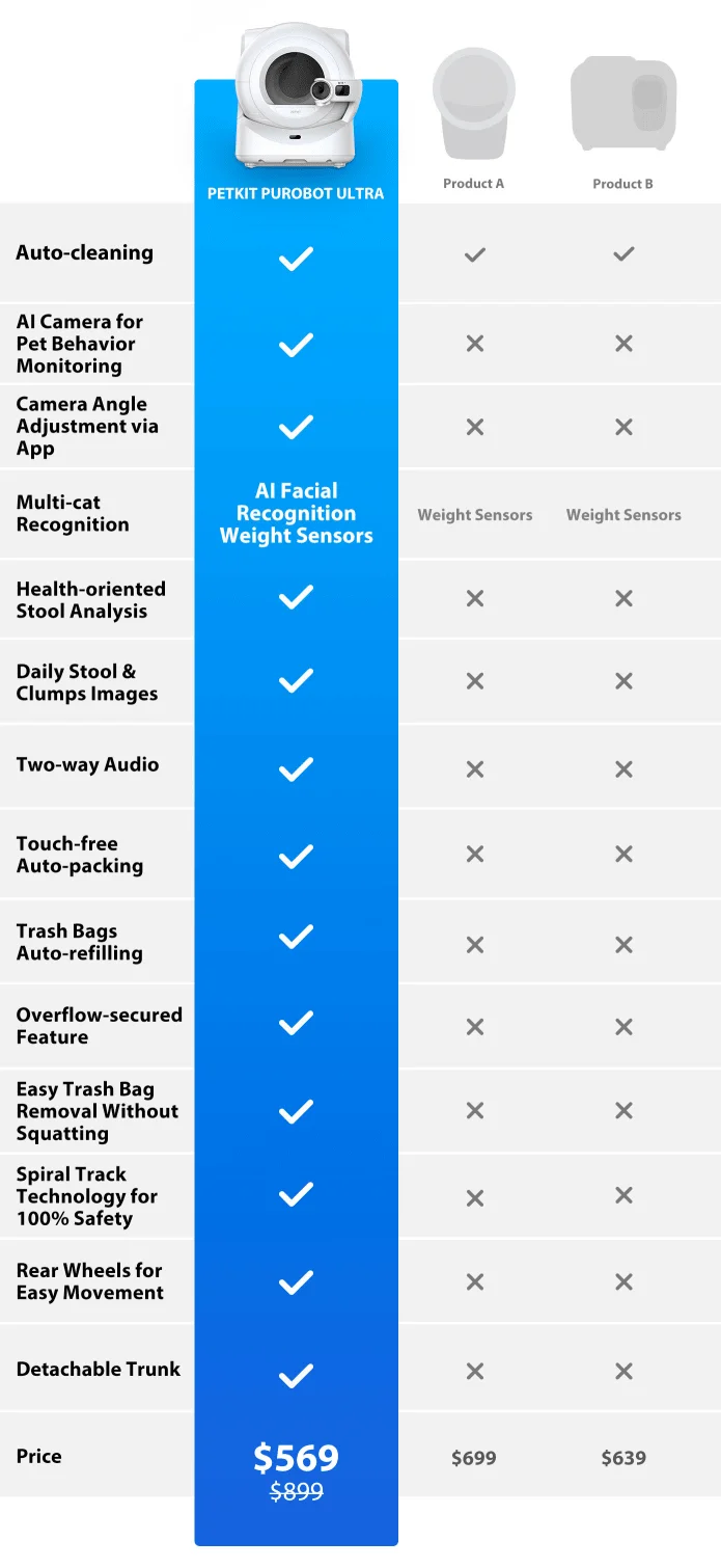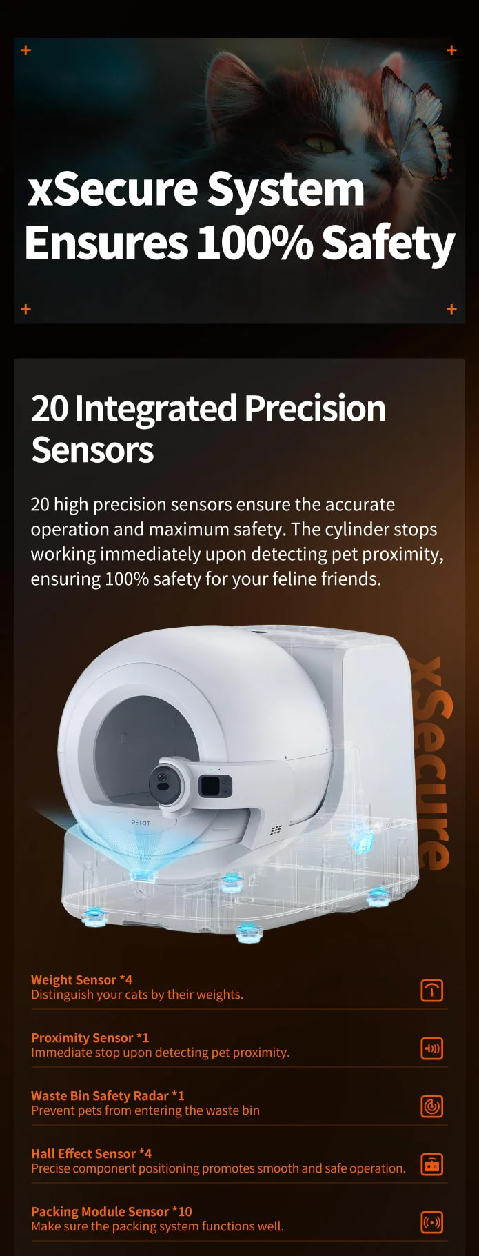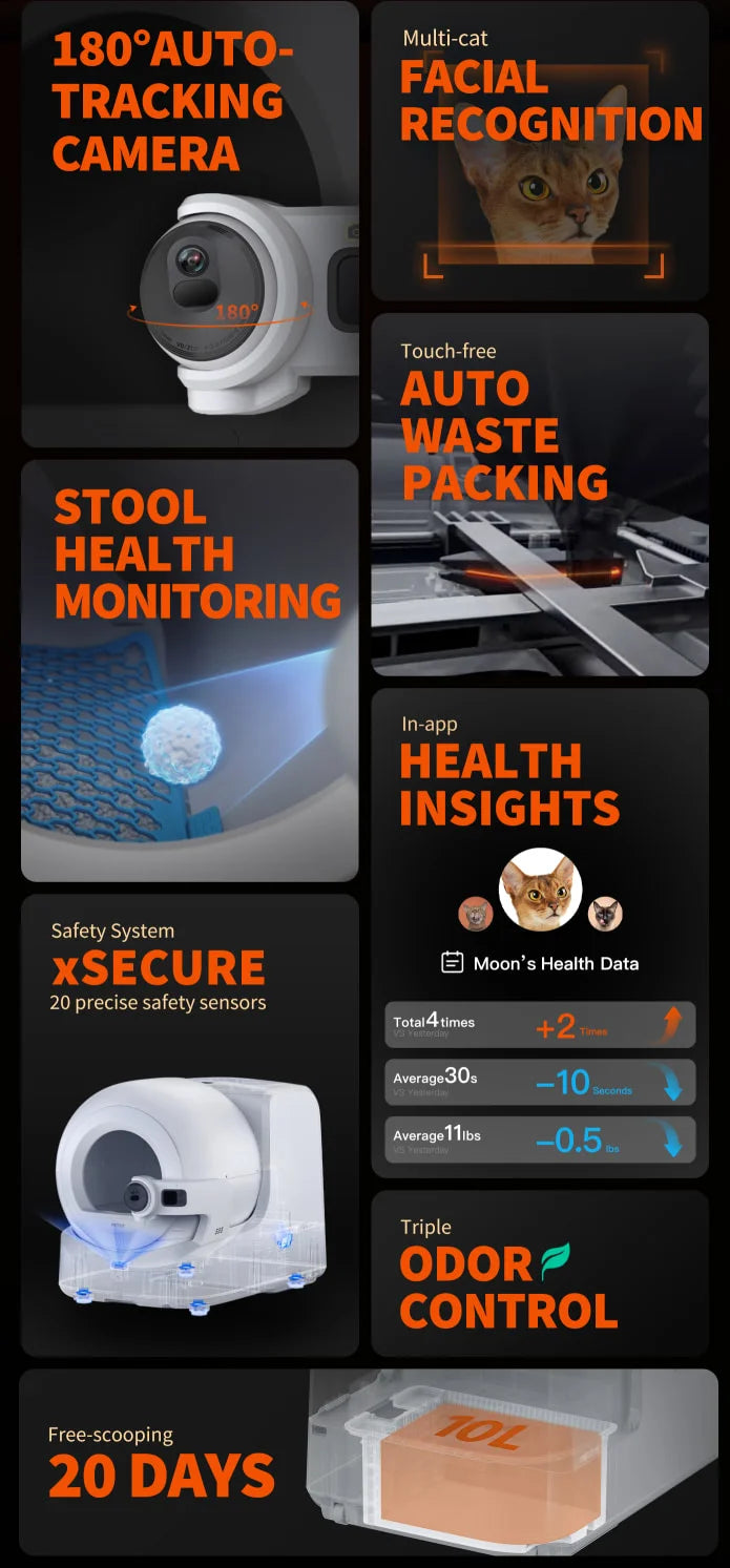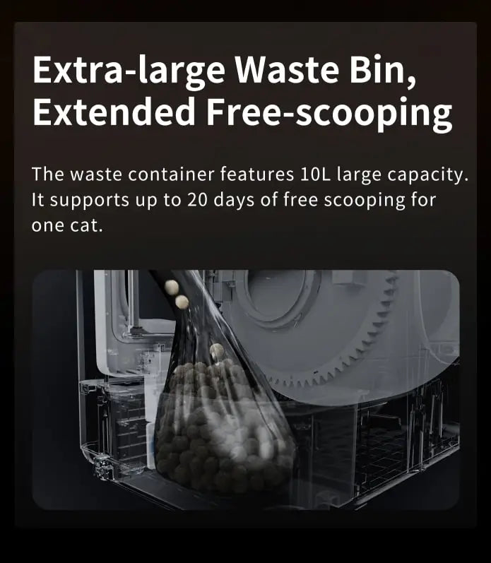 ULTRA Visual Smart AI is equipped with advanced artificial intelligence technology that can accurately identify your cat's behavior and needs. It is like a caring cat butler that keeps an eye on your cat's every move. When the cat uses the litter box, it will quickly start the automatic cleaning program without your manual operation, so that you are completely liberated from the tedious work of litter cleaning.