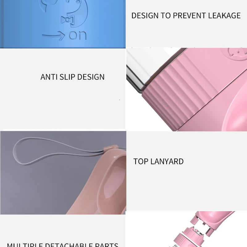 Portable kettle for going out, drinking fountain, water and food, outdoor dog drinking cup supplies, multi-functional pet water cup, feeding and feeding segmented design to meet the dual needs of pets for water and food, no longer have to worry about going out without eating and drinking. Rotate the water outlet without pressing, close to the left, and discharge to the right. Safe materials to ensure that pets are healthy and lively