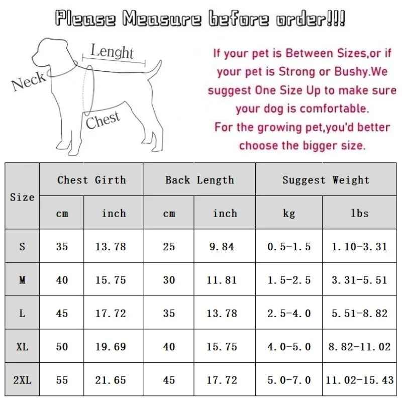 XXL:Length Girth 55cm/21.65'' ; Back Chest 45cm/17.72'' ;Suggest Weight 5.0-7.0kg/11.02-15.43 lbs