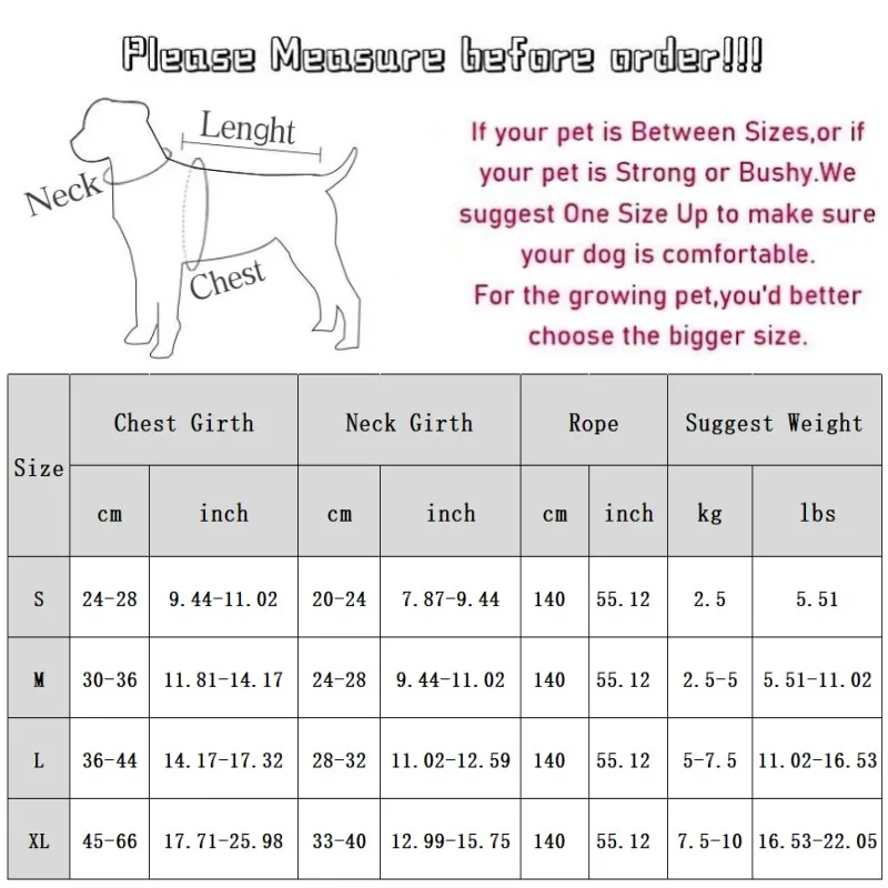 XL: Chest 45-66cm/17.71-25.98" ; Length 33-40cm/12.99-15.75" ; Rope 140cm/55.12" ; Suggest Weight 7.5-10 kg/16.53-22.05 lbs.