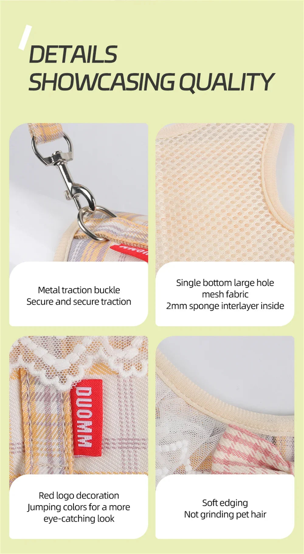 In summary, this Sweet Plaid Puppy Dog Harness with Bow Walking Pet Harnesses and Leash Set for Small Dogs is perfect for pet owners who want to keep their furry friends looking stylish and comfortable. Its sweet plaid design, comfortable fit, and firm control make it a must-have for all small dog owners!