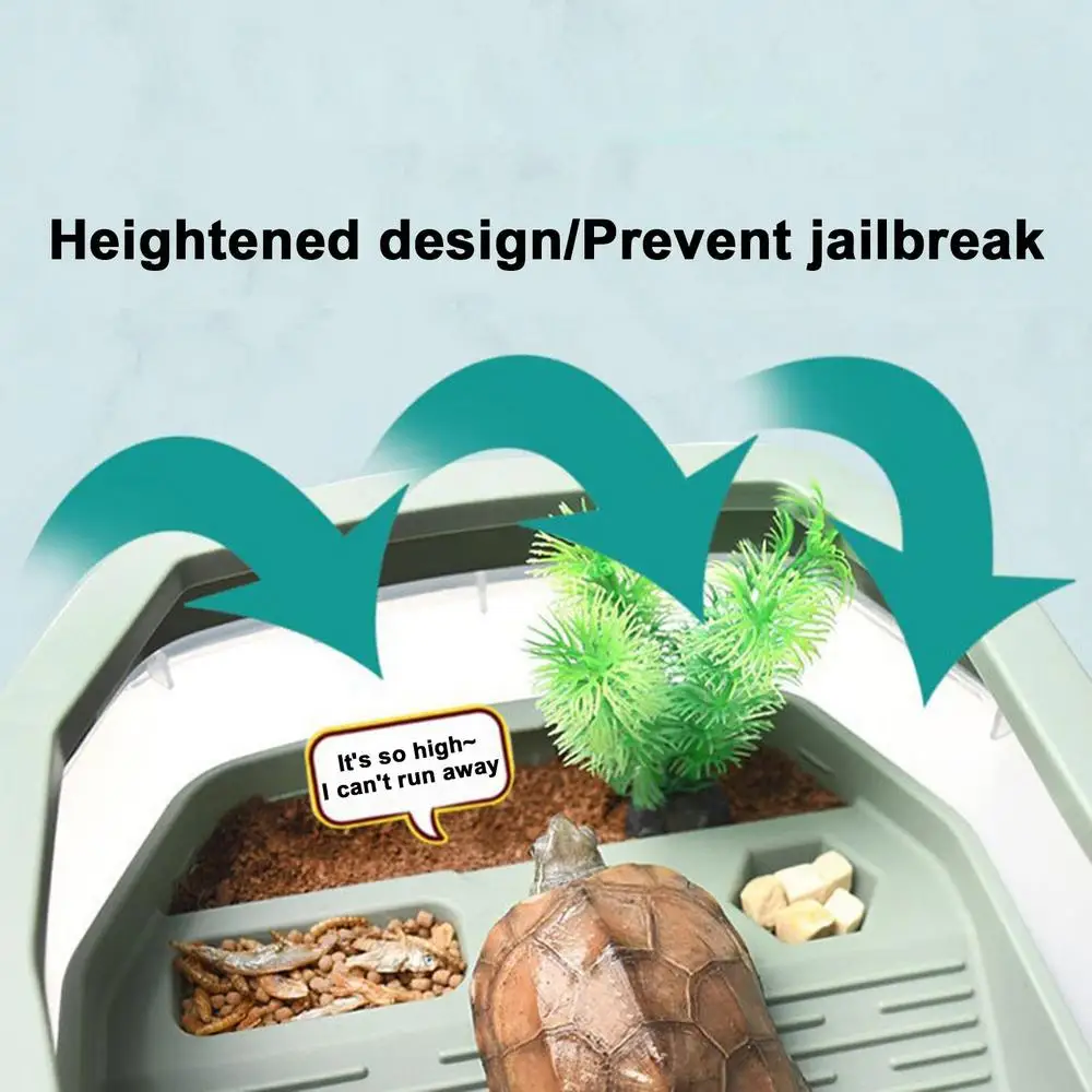1.Anti-escape Design : To prevent the turtle from escaping, this turtle tank comes with a cover that widens and heightens the rim of the tank. The cover also has a draining layer with the same color as the tank, which adds to the aesthetic appeal.
