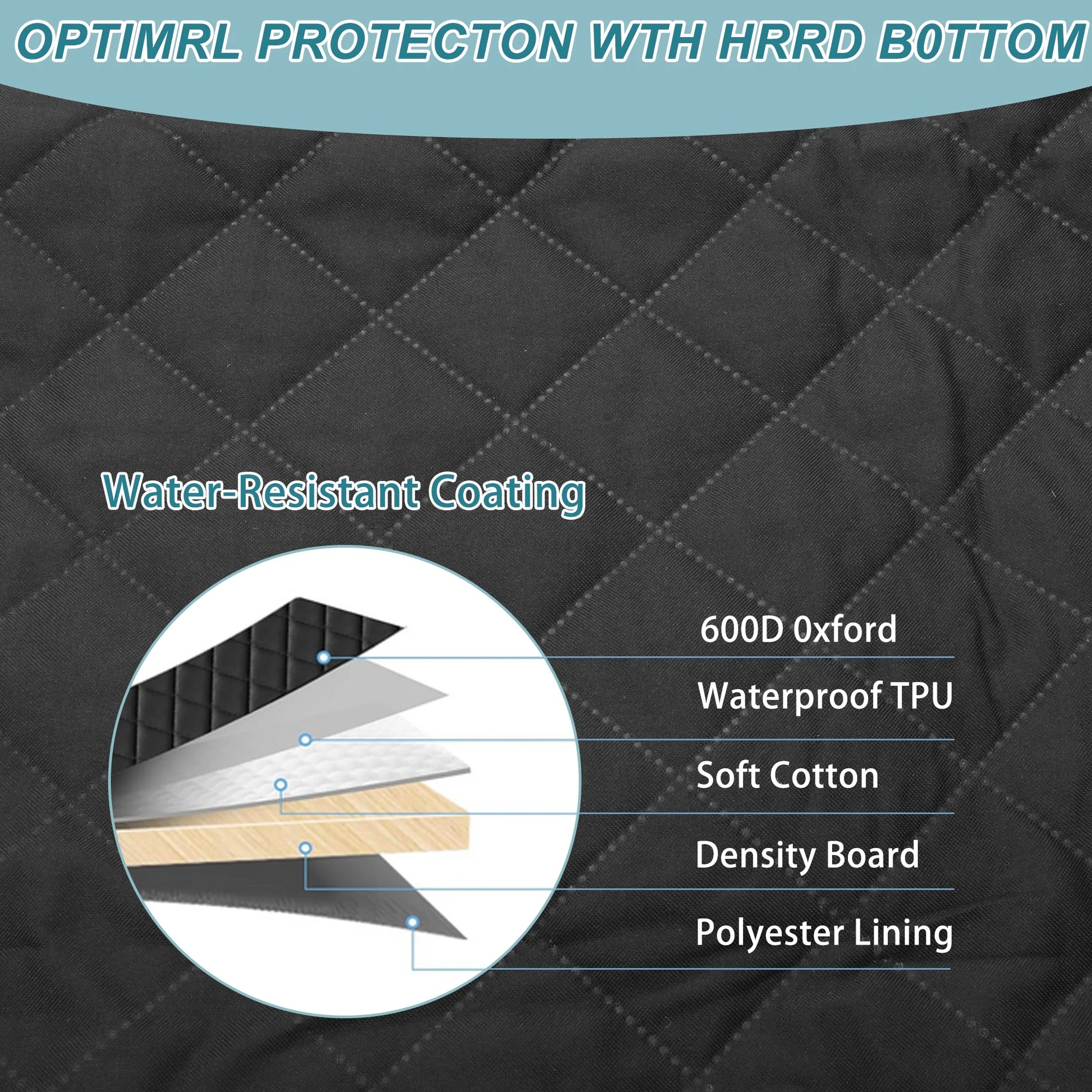 The dog car seat cover for the back seat waterproof exterior coating, a non-slip bottom, PP cotton filling for softness and comfort, ion material for durability, and anti-scratch properties.